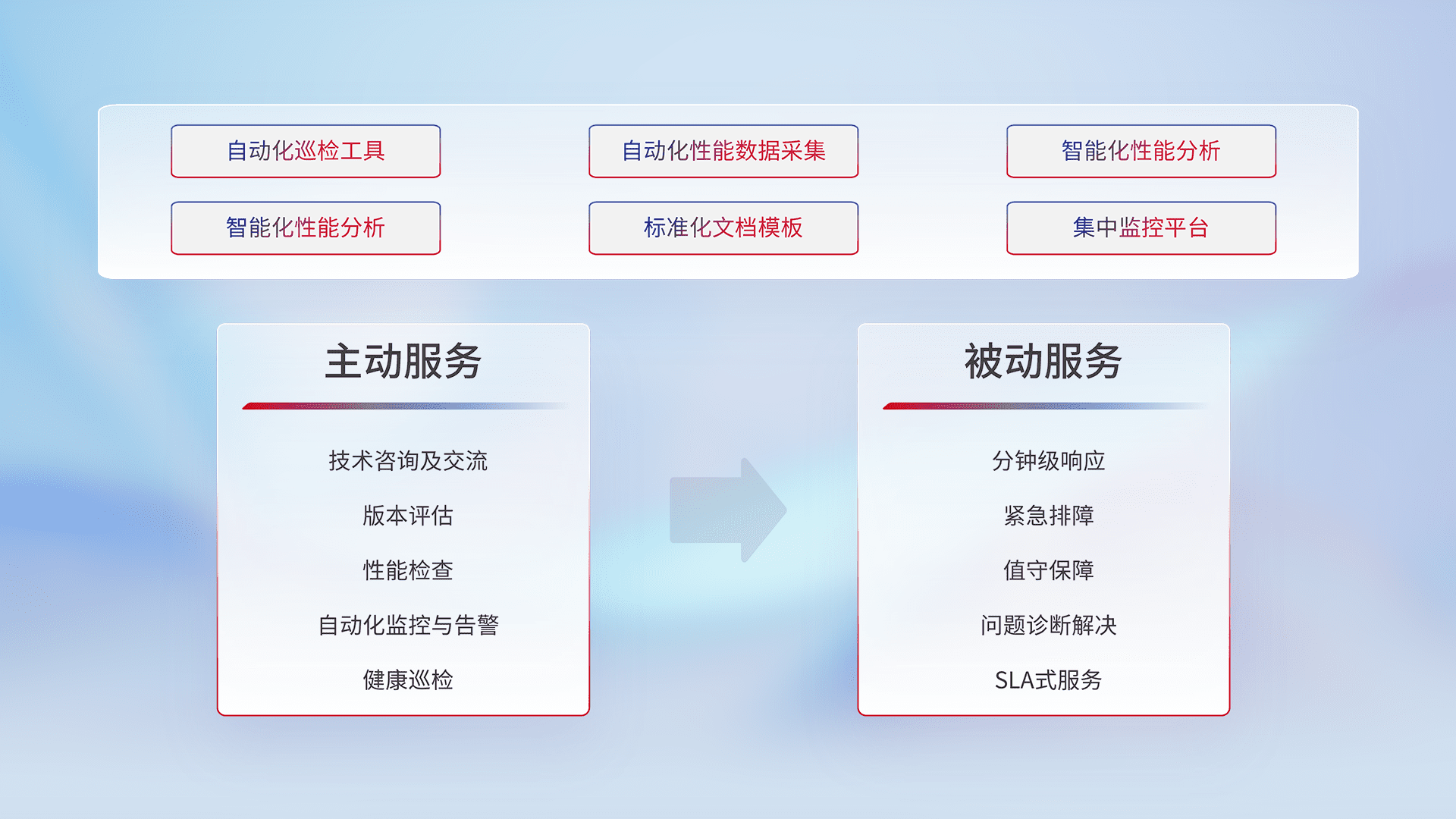 智能化工具和标准化文档,,保障服务质量,,,提供主动服务(包含技术咨询、、、、版本评估、、、、性能检查、、、自动化监控与告警、、、、健康巡检)和被动服务包含(分钟级响应、、、紧急排障、、、值守保障、、问题诊断解决、、、SLA服务)。。